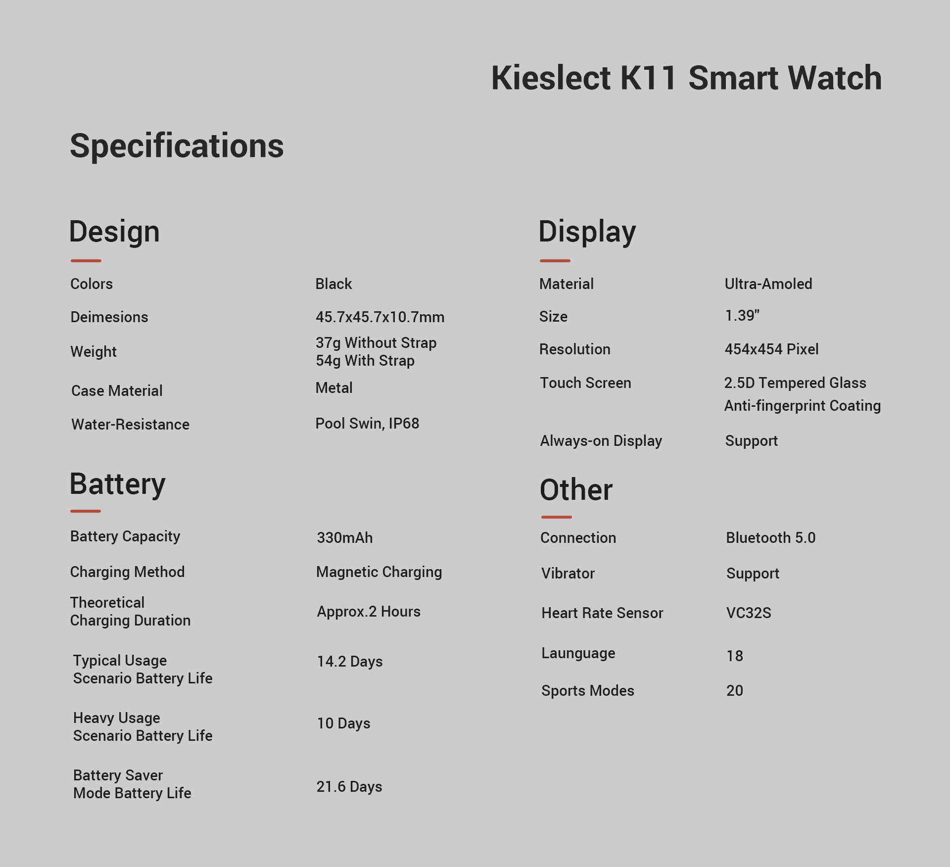 Kieslect Smart Watch K11 boasts a 1.39" ultra-AMOLED always on display. Its 20 workout modes and health-tracking functions allow you to achieve your fitness goals and know more about your health status.